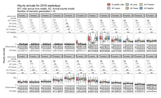 Hourly aggregated EV arrivals (2015, weekdays). Significance was calculated based on Wilcoxon tests (ns: not significant, p-value > 0.05; * p-value ≤ 0.05; ** p-value ≤ 0.01; *** p-value ≤ 0.001; **** p-value ≤ 0.0001).