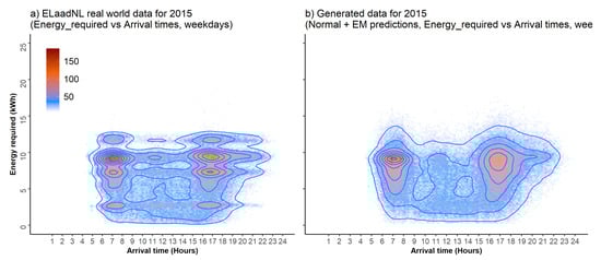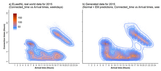 Conditional distributions for connection times (hours) and energy required (kWh) are plotted in Figure 8 and Figure 9 respectively. The plots on the left were created from the real-world data, and those on the right were created from the data generated from mixture models (). These figures are for weekdays, and similar plots were generated for weekends. Connection times (and energy required) were generated using GMM and real-world EV arrivals. Vertical divisions in the generated data for each times slot can be seen, because we use one GMM per combination.