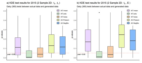 We generated full session samples including generated arrival times, connection times and required energy for all the models. These generated samples were compared with the real-world session data for 2015. To compare the models’ synthetic samples with real-world data, 2-sample KDE tests were performed. In Figure 10a, we show the KDE test for (, ), and Figure 10b shows the KDE test results on (, E). As we can see, the mean model for the IAT, and both models for AC have average p-values > 0.05, indicating that the generated data are similar to the real-world EV session data. We observed similar results in the multidimensional KS test. These results conclude that the generated samples are statistically similar to real-world data.
