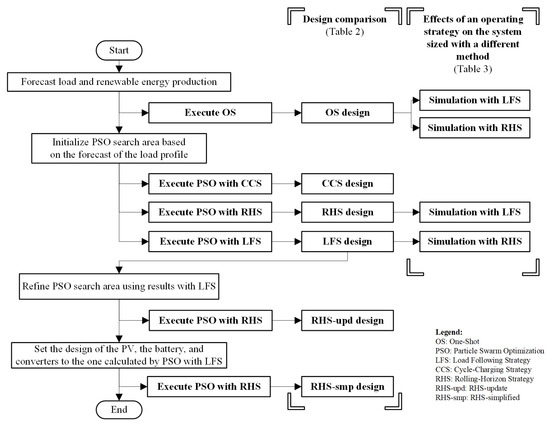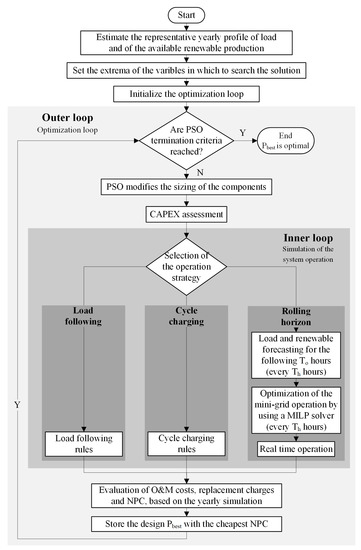 The optimization procedure is composed by two nested loops, as shown in Figure 1: in the outer one, the main PSO procedure iteratively draws multiple size scenarios of the components of the system whose corresponding NPC is then evaluated in the inner loop by means of simulations. According to the PSO algorithm, the solution is searched in a preset area delimited by given upper and lower bounds, set a-priori according to the expertise of the developer and the estimated load demand; the criterion that is proposed in this paper is described in the following section. The simulations in the inner loop are performed with three different operating strategies: the load following (LFS), the cycle charging (CCS), and the rolling-horizon (RHS) ones, which are well known in the literature and in practical applications [35,39]. More details on the operating strategies are described in the following Section 3.3.