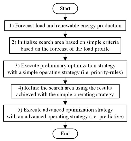 Once the initial search space is initialized, a preliminary optimization method is performed by using a simple operating strategy, which is fast to compute, such as based on priority-rules. This preliminary phase aims at reducing the search space for the more demanding optimization method that is based on predictive strategies that is subsequently performed. The time savings related to having a refined search space can overcome the additional burden of performing an initial optimization; this is why the proposed approach is promising when the preliminary optimization is fast to compute, such as when priority-rules criteria are used.