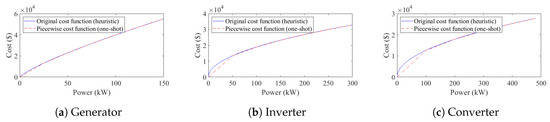 As already mentioned, heuristic optimization methodologies allow for the implementation of non-linear cost functions, while MILP-based methods, like OS, can only handle their piecewise linearized form. Therefore, firstly, non-linear cost curves have been derived while using the power model reported in (23), in which for every x-component, the cost for the reference size is considered, to obtain the cost of the component with a generic size . The exponent accounts for scale effects.