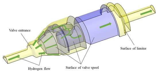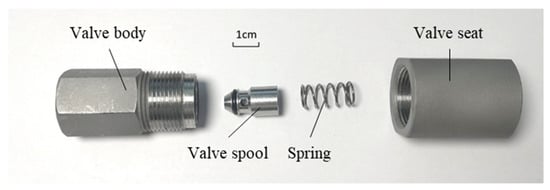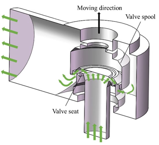 A check valve, which is typically used in hydrogen-refueling stations, was studied in this paper; see Figure 1. It consists of valve body, valve spool, spring, and valve seat. The valve spool is shaped like a truncated cone, and there is an O-ring on the valve spool surface. There is a through-hole in the radial direction of the valve spool, which can change the flow direction, and drive hydrogen flow into the valve spool. The valve spool is hollow inside and is used to set the spring and control the flow channel of the hydrogen gas. A limiter inside the valve seat is designed to limit the displacement of the valve spool.