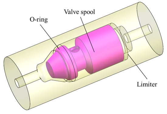 The mass of the valve spool is 7.2 g and maximum displacement of the valve spool is 2 mm. Both inlet- and outlet- diameters are 3 mm. A 3D model of the check valve is shown in Figure 2. If a high-pressure difference occurs between the front and back of the valve spool, fluid force is generated at the valve spool surface. When the fluid force exceeds the spring force and friction, the valve spool moves. Then, the O-ring seal fails due to clearance, hydrogen passes through the O-ring channel and enters the interior of the valve spool through the hole, reaching the downstream end of the pipeline.