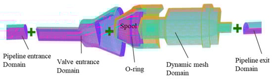 As shown in Figure 4, the structured meshes were constructed using ANSYS-ICEM for the four flow domains. The mesh density of the pipeline entrance domain and pipeline exit domain were relatively coarse, while the mesh density of the valve entrance domain and the dynamic mesh domain were relatively dense. The interface boundaries conditions were applied between the adjacent domains. Moreover, the intermediate section surface was set as the symmetry-plane boundary condition.