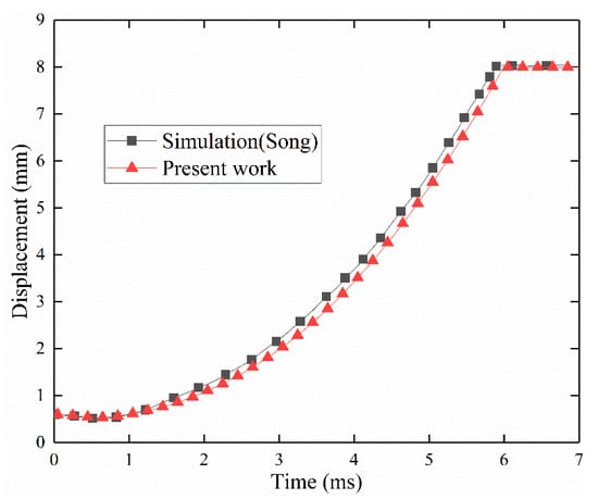 Figure 7 shows a comparison of the valve spool displacement for the two methods [20]. It reveals that the displacement curve of the valve spool shows the same characteristic in both methods. The time when the valve spool reached maximum displacement is defined as the maximum opening time of the check valve. The difference between the maximum opening time of the present study (6ms) and Song’s work (5.9 ms) was less than 2%. In addition, during the opening process of the valve, the displacement difference for the two methods was very low, and the trends were almost identical. The above results confirm that the numerical method used in our study is valuable for finding the transient flow characteristic of high-pressure hydrogen check valves.