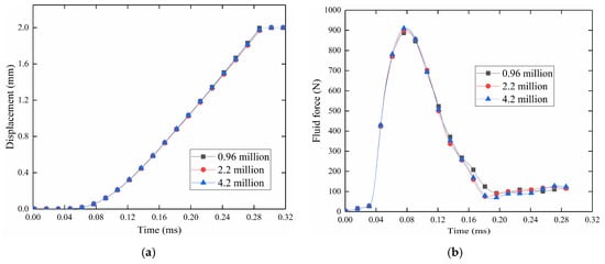 Figure 8a shows the displacement of the valve spool for the three models during the opening process. At the beginning of the process, because the hydrogen flow occurred far away from the valve spool, there was no displacement. After 0.05 ms, the impact of the hydrogen flow started. The high-pressure hydrogen flow generated a maximum fluid force of 900 N in a very short time; see Figure 8b. The huge fluid force pushed the valve spool to the end of the movement (at about 0.3 ms). The three models show a good consistency for the displacement and fluid force characteristics, with a difference of less than 1% between the models. Considering the accuracy, stability, and economical of the simulation, a model with 2.2 million mesh density was selected.