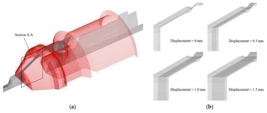 Initial and updated meshes for the chosen mesh: (a) Initial meshes of the valve spool and symmetrical plane; (b) Updated meshes of section A-A during the transient.