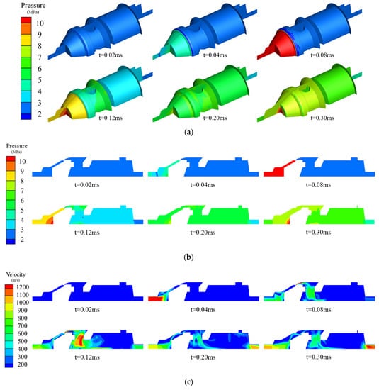 Case 3 in Table 1 was calculated to study the flow performance of the check valve. Figure 10 shows the flow contour for the check valve at 0.02 ms, 0.04 ms, 0.08 ms, 0.12 ms, 0.20 ms, and 0.30 ms. Figure 10a shows the pressure distribution on the valve spool surface. Figure 10b shows the section of the flow channel for the valve spool, which provides a better representation of the pressure distribution inside the valve spool. Figure 10c shows the velocity distribution of hydrogen flow at the check valve.