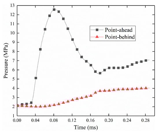 The movement characteristic of the valve spool was investigated. Figure 11 shows the location of two monitoring points: One is in the cavity region in front of the valve spool and the other at the outlet pipe. Figure 12 shows the pressure variation for the two monitoring points. Before t = 0.03 ms, the pressure remained almost unchanged. After 0.03 ms, because of the arriving high-pressure hydrogen gas, the pressure in this area increased sharply and reached the maximum value at 0.08 ms, which was 12 MPa. Subsequently, the pressure of the point-ahead decreased sharply to 5.6 MPa at 0.18 ms. After that moment, the point-ahead pressure gently increased. The point-behind pressure distribution shows that the pressure in this region resembles more a hysteresis than the point-ahead region. The pressure increase was also consistent with the point-ahead pressure increase. At the end of the opening process, the pressure in this area was about 4 MPa.