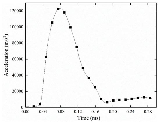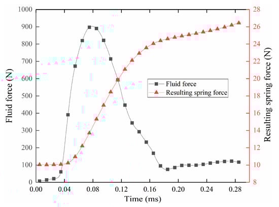 Figure 13 shows the relationship between the fluid force and resulting spring force during the opening process. In this paper, the resulting spring force includes the spring force and the damping force. Figure 14 is the acceleration variation for the valve spool during the opening process. As shown in Figure 13; Figure 14, from 0 ms to 0.04 ms, because the valve spool was not affected by the high-pressure hydrogen flow, the pressure, displacement, velocity, and acceleration were almost 0. From 0.04 ms to 0.08 ms, due to the impact of the high-pressure hydrogen flow and the small opening gap of the valve spool, the pressure in the connection-cavity increased rapidly, the fluid force at the valve spool surface increased rapidly to 900 N, and the valve spool acceleration also sharply increased to a very high value (1.2 × 105 m/s2).