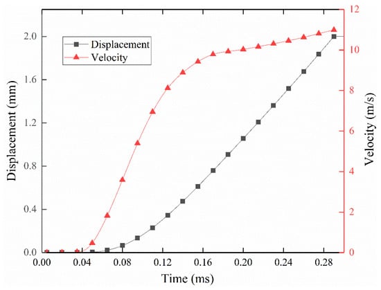 Figure 15 shows the relationship between displacement and velocity of the valve spool and the opening time. At the beginning, when the high-pressure flow has little effect on the valve spool, the valve spool remained still. After 0.04 ms, the high-pressure flow started, the flow force and the acceleration of the valve spool increased sharply, the velocity of the valve spool increased very quickly, and the displacement increased too. At 0.18 ms, the velocity of the valve spool turn increased quickly into increased gently; this is because the acceleration is reduced to a minimum. Subsequently, a variation of the velocity and the displacement of the valve spool was consistent with the acceleration characteristic. When the valve spool arrived at the limiter, the velocity of the spool was about 10.9 m/s. The displacement vs. time curve in Figure 15 is similar to the work by Song [19] in Figure 7; the difference is the maximum opening time. This is because the pressure is higher, and the spool is lighter in the present work.