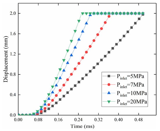 Figure 16 shows the relationship between the lift of the valve spool and the opening time of the check valve at different inlet pressures. Before t = 0.05 ms, due to the impact shock (because high-pressure hydrogen flow did not occur at the valve spool), the displacement of the valve spool was 0. As the impact from high-pressure hydrogen flow began to happen, the displacement of the valve spool increased quickly. In case 1 Pinlet = 5MPa, the maximum opening time was 0.5 ms. When the driving pressures were 7 MPa, 10 MPa, and 20 MPa, the maximum opening times were 0.37 ms, 0.28 ms, and 0.25 ms, respectively. As the inlet pressure of the hydrogen gas increased, the maximum opening time of the check valve was shorter. This happened because the higher pressure generated a higher fluid force and acceleration, which caused the valve spool to move faster.