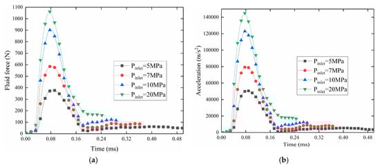 Fluid force and acceleration of the valve spool for different inlet pressures: (a) Fluid force for the valve spool vs. time; (b) Acceleration of the valve spool vs. time.