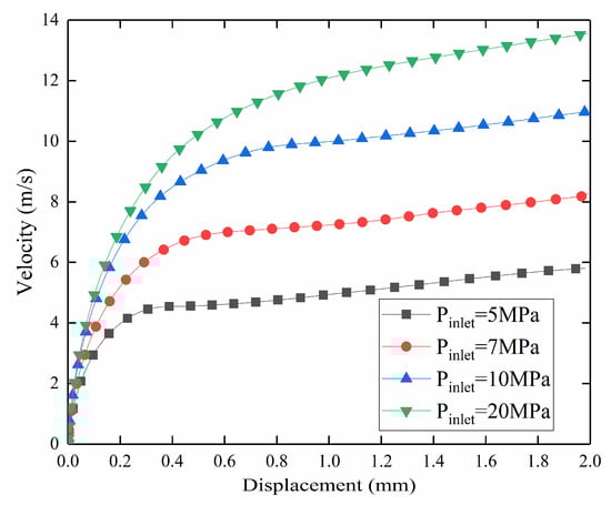 Figure 18 shows the change of valve spool velocity with the displacement during the opening process. When the impact of the high-pressure hydrogen flow occurred, the velocity of the valve spool increased rapidly. During the opening process, when the valve spool reached the limiter, the velocity of the valve spool reached its maximum. As shown in Figure 18, for Pinlet = 5 MPa, 7 Mpa, 10 Mpa, and 20 MPa, the maximum valued of the valve spool velocity were 5.9 m/s, 8.2 m/s, 10.9 m/s, and 13.6 m/s, respectively. This shows that inlet pressure of the hydrogen gas clearly affected the velocity of the valve spool. As the inlet pressure of the hydrogen flow increased, the maximum velocity of the valve spool increased too. Considering the fluid force was also very high, the crash between the valve spool and the limiter was substantial. The results of our studies can help develop safer designs and more reliable application of check valves in the future.