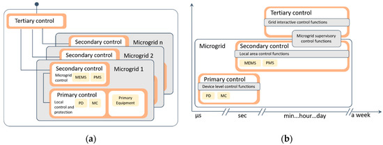 Figure 1b presents the time frame and action time domain of an MMS. The device-level control or the primary control of a microgrid act in the range from microseconds to seconds. The local area control functions and microgrid supervisory control functions are the secondary control acting in the range from seconds to days. The tertiary control is the grid-interactive control functions or microgrid supervisory control functions acting in the range from minutes to days or a week [6].
