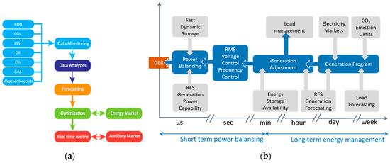Furthermore, the MEMS can be considered for long-term energy management as well as a short-term power balancing system, as presented in Figure 2b. Long-term energy management includes load forecasting, generation prediction, energy storage reserve, energy estimation, peak shaving, operational planning, reduction in CO2 emissions, provision of adequate capacity of power reserve in conformity with the electricity market, and demand forecasting. Short-term power balancing includes real-time power dispatching between DER internal sources as well as RMS voltage regulation and primary frequency control [35].