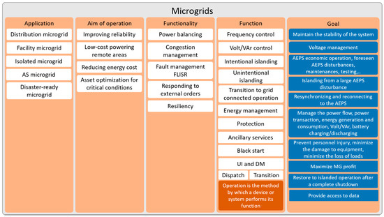 The framework for the functional analysis of microgrids is made “top-down”, as illustrated from left to right in Figure 3. The highest level describes the application where the microgrid concept is applied and further the aim of the microgrid operation, as presented in Section 2.1. Next, the microgrid functionalities from the management point of view are given, highlighting that functionality (or feature) is the sum of functions or any aspect of what a microgrid can do for a user, e.g., distribution system operator (DSO). In other words, functionalities of the microgrids are used for identifying its features but also for enabling a user to gain specific capabilities. Finally, the general microgrid functions are defined as presented in Section 3.3 and especially two core functions: dispatch and transition, which are presented in Section 3.1. The last column in the left shows examples of the goals of the microgrid functions. In the following, some examples are used partly from [9,40] to present how a microgrid functionality can be formed from several microgrid functions or how different functions are interlinked.