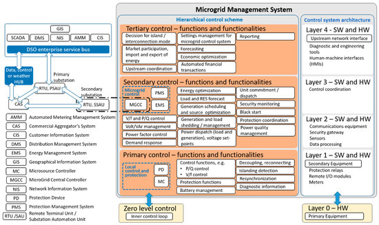 This paper introduced several microgrid management functions based on the current standardization and research. Based on these, the functionalities of microgrids were aligned not only to the control scheme hierarchy that includes three known control levels: primary, secondary, and tertiary, but also to zero control levels. In addition, a control architecture, including four control layers, was presented. Two specific separate systems were identified, namely, the energy management system and the protection system.