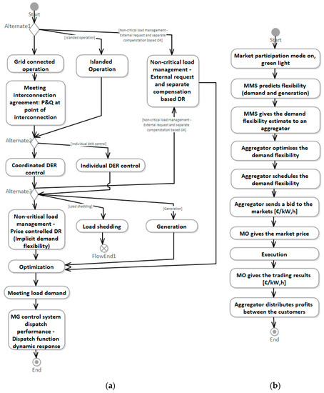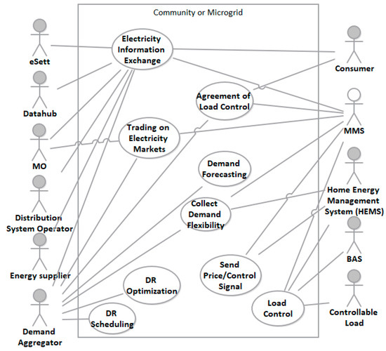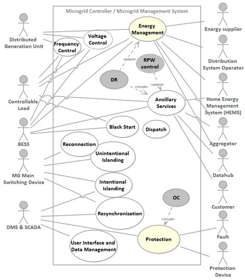 Ten primary use cases were modeled for a microgrid control system or an MMS in Oak Ridge National Laboratory [31] based on microgrid controls and operational functions described in [32]. These use cases aim to capture the key requirements of a microgrid controller. The basic functions or use cases modeled were: