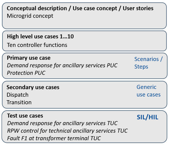 Therefore, this research aims to define, study and analyze the functions of microgrids by taking into account the functionalities of microgrids, the aim of operation as well as the different power grid applications to the extent appropriate to the context. Furthermore, the studied microgrid functions are implemented in the operation of an MMS by developing relevant levels of use cases, that is, behavioral descriptions. Based on a selected (test) use case, a simulation model is developed for further case studies and controller development and vice versa, an existing simulation model and a simulation case study are described by developing a corresponding (test) use case. These selected cases differ with their operating or functioning time-frame—one is related to protection in electromagnetic transients (EMT) simulations, and the other two are related to demand response and reactive power control in RMS transient stability simulations. These three types of test cases were selected to highlight that use case modelling, simulation, and testing over different time domains, as co-simulation is essential in the research and development of microgrid control systems.
