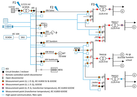 In Figure 19, it is assumed that the IED-E01 detects the fault F1 either with its main 1 differential protection function (a) or main 2 definite time overcurrent (b). If the fault is detected by the differential protection function, IED-E01 publishes the fault detection GOOSE message “GOOSE_1BOOL” (transfer trip of the POI) and sends the tripping command to CB E01. After receiving the GOOSE_1BOOL message, IED-J05 sends the tripping command to CB J05. Alternatively, the fault F1 is detected by the main 2 definite time overcurrent function of IED-E01. Here the reverse interlocking scheme can be applied, so that if IED-J05 detects a fault at the MV busbar, it publishes the GOOSE message “GOOSE_2BOOL” (interlocking signal). In the fault F1, IED-E01 detects the overcurrent and receives no GOOSE_2BOOL message, which also results in the tripping of CB E01 and a transfer trip command “GOOSE_1BOOL” is sent to IED J05. Additionally, the IED-BESS receives the GOOSE_1BOOL from the IED-E01 and activates/connects the BESS rapidly so that it can act as the grid-forming source for the islanded part of the SSG without the disconnection of DGs. In this fault case, the fault is removed completely after the tripping of CB J05, and smooth transition to the islanded mode can be ensured without the disconnection of DGs. Moreover, the anti-islanding protections at the DGs need to be deactivated until a stable islanded mode operation is reached. After reaching a stable islanded mode operation with voltage and frequency maintained in the islanded section, the anti-islanding protections of DGs are reactivated, and the protection settings of IEDs are changed to the settings suitable for the fault detection in the islanded mode. In this use case, the BESS is assumed to be normally disconnected in the grid-connected mode, and it is activated only during the islanded mode of operation.
