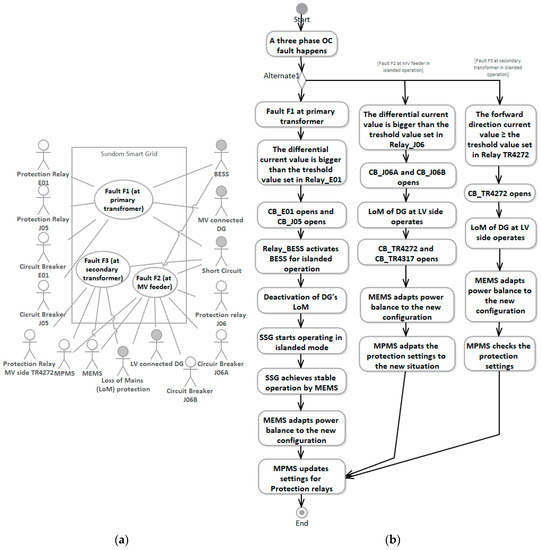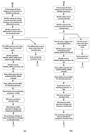 The activity diagram of the OC fault F1 at the transformer terminal TUC is presented in Figure 19, which is developed based on the IEC 61,850 GOOSE communication-based definite time overcurrent relay case studies conducted in [51]. The main difference between the network presented in [51] and the SSG (Figure 8 and Figure 18) is that in the SSG, there is also differential protection functioning as the main 1 protection and the definite time overcurrent protection function as the main 2 protection for the transformer, whereas in [51], there is only an overhead line protected by a definite time overcurrent protection function.