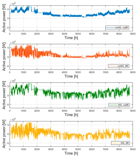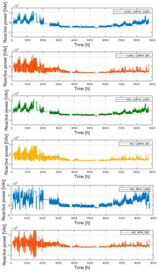 Figure 17 shows the results of the reactive power flow at the HV/MV connection point in different case studies. The first figure at the top describes case 1 (case 1 also in DR). When comparing it to Figure 15, it can be noticed that the reactive power flow curve follows the curve of the active power flow. The second figure, case 2, describes the situation that is the same as case 2 in DR. It can be noticed that executing the DR program causes fluctuations in the reactive power flow similar to active power. The third figure, case 3, is the same as case 3 in DR. In this case, the curve of the reactive power flow does not follow the shape of active power. This can be explained by the fact that the WT is connected via a short connection directly to the MV bus at the primary substation and, therefore, the line does not generate reactive power to a great extent. In the fourth figure, case 4 (the same as case 4 in DR), the shape of the reactive power flow curve differs from the active power flow because of the changes in the active power generation of the WT as well as because of DR. The generation is near the substation, but the demand is happening in “customer premises” via long connections. The cabling affects the amount of reactive power generation (capacitive). In this study (the year 2018), the cabling degree (the share of the length of the underground cables in the network) is 31%. The next two figures present the results of case 5 and case 6. Reactive power control is executed in these cases, and it can be noticed that executing DR generates fluctuations in the reactive power flow.