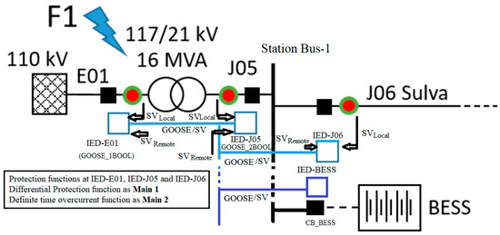 In this TUC, the transformer protection is implemented at the primary side protection relay IED-E01, which operates the CB at E01 and is connected to the secondary side relay IED-J05, as shown in Figure 18. The secondary side relay IED-J05 is a part of the MV busbar protection and also operates the POI of this microgrid (CB J05). The function of the PD1 is to isolate the primary substation from the utility grid during the line fault conditions. The PD2 (LBS + IED-J05) is located on the secondary side of the transformer. Figure 18 shows the single line diagram for the overcurrent fault F1 at the transformer primary side terminal. Figure 18 is drawn based on Figure 8 to include only the related devices involved in fault F1 to understand how they interact with each other in this fault case. As indicated in Figure 18, the differential protection function is used as the main 1 protection and definite time overcurrent protection function is used as the main 2 protection at IED-E01, IED-J05 and IED-J06, which receive local sampled value (SV) measurements (SV Local) available at these locations. The remote SV measurements (SV Remote) of other bays in the substation can be subscribed by these IEDs using the Ethernet-based high speed communication network, station bus 1. The local and remote SV measurements are used for the detection of the fault by the main 1 and main 2 protections, and GOOSE messages are published and subscribed to indicate and determine whether a fault exists on the remote end.