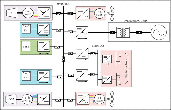 A notational diagram of the MVDC shipboard system considered in this paper is shown in Figure 1. To validate the proposed topology, a radial 6 kV MVDC bus is modeled in Matlab/Simulink environment. Two variable speed diesel engines (DG1 and DG2), each rated 3MW, are connected to the six-phase permanent magnet synchronous generator (PMSG) via the mechanical link. PMSG is connected to the MVDC bus via two-level twelve-pulse voltage source converter used as an active front-end rectifier. In addition, two PV arrays, each rated 200 kW and BESS rated 600 kWh, are integrated into the system. Propulsion motors, each rated 2 MW, are also modeled as a six-phase permanent magnet synchronous motor (PMSM). Ship propellers are driven by variable speed electric motor drives. The generators are responsible for supplying power to the two propulsion motors and service loads of the cruise ship. Ship service load, such as heating, ventilation and air conditioning (HVAC), and lighting loads are supplied through a low voltage DC (LVDC) bus with suitable DC-DC or DC-AC converters, depending on the nature of the loads. Finally, the MVDC bus is extended to connect to the AC electric grid via a three-phase neutral point clamped (NPC) interlinking converter and transformer for the purpose of cold ironing.