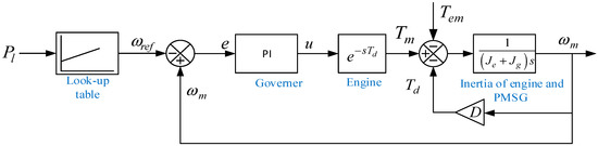 To improve the efficiency and fuel economy, the minimum load of the constant speed diesel engine should not be less than 40–60% [29] of its rated capacity. However, variable speed operation of a diesel generator allows variation on speed according to the load condition, and hence it can even operate at a light load condition with better efficiency and minimal SFOC than constant speed operation [30,31]. A simplified dynamic model of the diesel engine used in this paper consists of a speed controller, an actuator, and an engine, as shown in Figure 2.