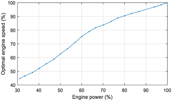 To minimize fuel consumption, the optimal reference speed for the diesel engine is computed by using a look-up table where the optimal power–speed curve as given in Figure 3 is implemented.