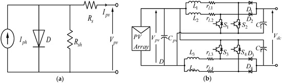 The escalating cost of fossil fuels and the regulatory compliance to reduce the emission of greenhouse gases has forced the shipping industry to deploy renewable energy sources, such as PV systems, as an alternative means of ecofriendly transportation [38,39]. Normally, power from the PV system depends on the solar irradiation profile and cell temperature of the PV array in an offshore installation. However, in the case of an onboard application, it also depends on other climatic factors and the nature of the voyage (longitude and latitude of navigation route) [40]. The capacity of PV installation relies on the available free deck space (roof, facade, starboard, etc.) which also depends on the type of ship. In that context, PV installation is assumed to be 20% of the total onboard generation system, as recommended in [10,40]. In this paper, with the scope of extracting the maximum power from the PV array, a flying interleaved boost converter (FIBC) is used with a variable step size incremental conductance algorithm. Since the PV system is connected to the DC-link voltage that is as high as 6 kV, the main reason behind using FIBC is to minimize the voltage stress over IGBTs and the other reason is to minimize the ripple of the input current. The design and modeling of FIBC is coherent with [41]. The circuit diagram of a PV array connected to the FIBC and single diode model of a PV cell is shown in Figure 5. Simulation and design parameters of the PV system are presented in Table A2 of Appendix A.