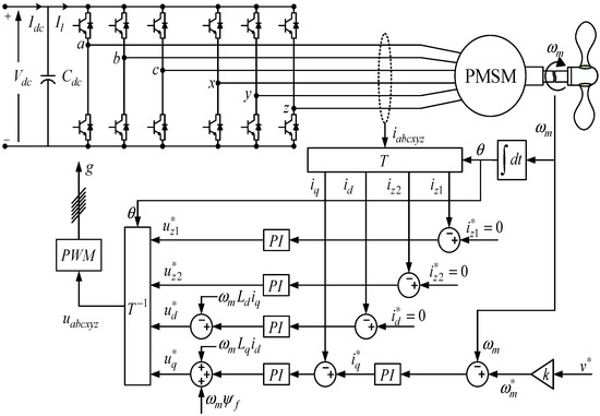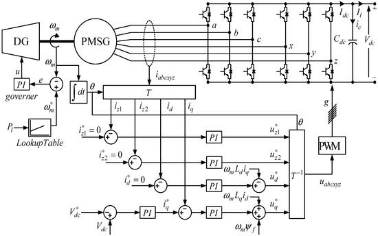The overall control structure of the six-phase PMSG has three control loops: speed control loop, DC-link voltage control loop, and current control loop, as shown in Figure 10. The current control loops form the primary current control structure. As expressed in (13), the model of six-phase PMSG in subspace is composed of fundamentals and harmonics. Since the fundamental component interacts with the rotor flux linkage in the air gap of the PMSM, it is responsible for generating electromagnetic torque [47]. Therefore, control of the component along subspace will control the electromagnetic power flow in PMSM. However, for the non-salient pole six-phase PMSG considered, ; electromagnetic torque will be linear only with q-axis component as expressed below: