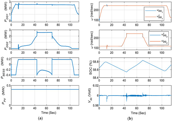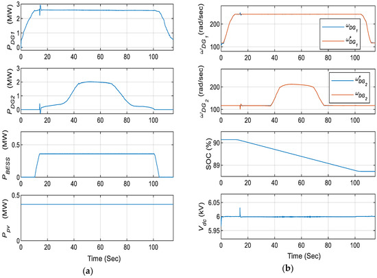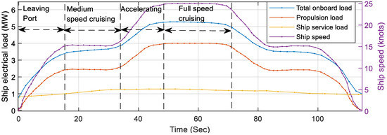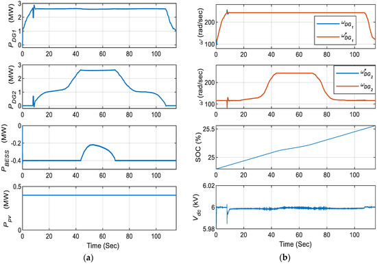 While in berth-out mode, the DC bus of an onboard MVDC distribution system is disconnected from the onshore grid, thus making it a mobile islanded DC microgrid. In this mode, the mode selection switch, as shown in Figure 9, passes the unity value such that both the primary and secondary control comes in action at the same time. The control over the DC-link from the interlinking bidirectional converter is released and onboard converters come into action to take control over the DC-link while operating in droop controlled mode. Along with that, the mode controller also signals for starting the DGs as soon as the ship enters in this mode. The total load on the system during this mode will be the sum of propulsion and ship service load.