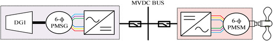 Electrical generators form the major power source of the shipboard microgrid in delivering the mechanical power from the diesel engine to the MVDC distribution system via an appropriate converter. References [12,13,14,15] provide a detailed overview of the generators/alternators applicable for the MVDC distribution system with their possible merits, demerits, and applicability, in addition to the technologies under research and development. In [13], some proven technology of alternators for the onboard MVDC grid, such as wound-field salient pole low-speed alternators, wound-field laminated round rotor alternators, turbo-alternators, and permanent magnet synchronous generator (PMSG), are mentioned. In addition to that, it also highlights the importance of PMSG machines as a suitable generator to supply DC systems through rectifiers, but it does not provide detailed results and discussion on the application of PMSG as a potential alternator for onboard MVDC grid. Furthermore, [15] also focuses on the employment of PMSG as an onboard generator and provides simulation results to verify the suitability of PMSG as the potential alternator. PMSG, despite being a strong candidate for a generator of the onboard power system, another very specific issue to be addressed is to guarantee continuity of motoring and generating operations for use in electric ships. In this context, a simple three-phase PMSG may not be the potential solution. Hence, [1,13] suggest the adoption of multiphase technology for their inherent fault tolerance features and reduced power rating per phase in an electric propulsion system. In the same context, [16,17] purpose the use of multiphase multipulse generation for the MVDC system with cascading of the rectifier unit for realizing a higher number of phases. However, [18] states that output performance advantages, which could be gained by increasing the number of phases above six, are not significant. Therefore, in this paper, we consider six-phase PMSM as a suitable candidate for both generation and propulsion purposes.