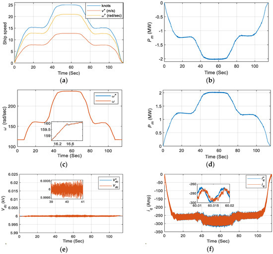 The control strategy of the PMSM as a motor is the same as that of the PMSM as a generator, except the outer voltage control loop is replaced by a speed control loop, as shown in Figure 11. The outer speed control loop is designed to run the propeller motor at the desired angular speed so that the ship travels at a specified speed . The ship operator determines the specified speed of the ship. Transformation of specified linear ship speed to angular speed depends upon the propeller blade pitch angle and rotor diameter, if the water is assumed as an inelastic medium. For simulation, these dependencies are simplified by a constant factor in this paper. It should be noted that the reference q-axis current would be positive for PMSM in motoring mode.