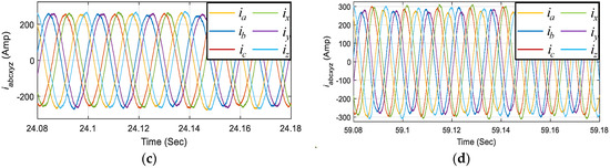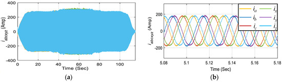 The model of the six-phase PMSM developed based on the Equations (1)–(6) can be used to simulate either a generator or propulsion motor, depending upon the direction of torque applied. The parameters used for the six-phase PMSM as generator and motor considered in this paper are provided in Table A1 of Appendix A.