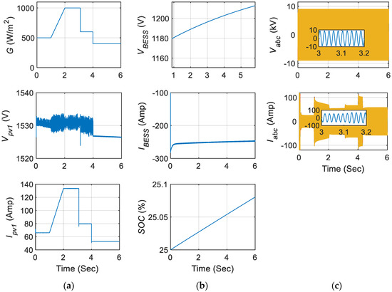 System characteristics during berth-in mode: (a) insolation, PV output voltage, and current waveform; (b) BESS voltage, current, and SOC waveform; (c) grid side voltage and current waveform at the point of common coupling.