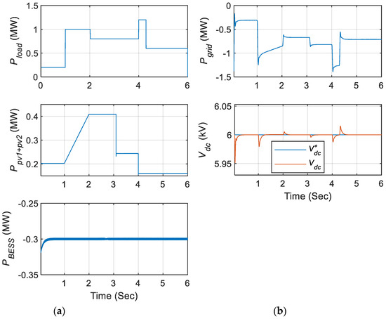 The simulation results in Figure 20 show the power flow waveforms between the onshore grid and onboard system, and the DC-link voltage waveform during berth-in mode. Since, power output from PV array alone is insufficient to supply the load added to the charging power of BESS, deficit amount of power is supplied by the onshore grid as shown in Figure 20b. Furthermore, dc-link voltage is stable during the major load changes and variation in output power of PV system, ensuring the stable operation of onboard power system.