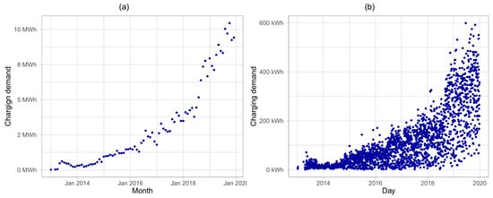 As Table 1 shows, the number of unique users, the number of charging sessions, and the total energy demand of PEV charging are all rising. Figure 1a shows the energy demand for each month in the dataset, and Figure 1b shows the daily energy demand. While there is a clear increase in demand over time, the daily data show a large amount of variability on any given day.