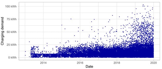 In the field of charging behavior, the authors of [32] studied the hourly electricity demand profile by analyzing the users’ charging behaviors. They focused on the time and location of the charging sessions. An algorithm was developed to predict the changes in PEV charging demand over time. Moreover, the authors of [33,34] utilized information from traveling surveys to generate a load profile for charging electric vehicles, considering that PEVs are traveling like conventional vehicles. The authors of [35] conducted research to find the correlations, if any, of the behavior of PEV drivers to how they charge their car. About 3 million charging sessions were analyzed, and it was found that the time of day that the session starts determines (for the most part) how long a session will last. In similar methodology, the authors in [36,37] found that the location and the start time of the charging session have the greatest influence on the charging behavior, due to parking behavior aligning with charging behavior.