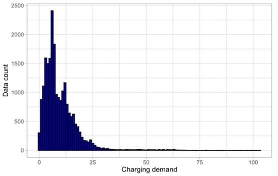 In order to more accurately analyze and predict trends in charging behavior, several data points were removed from the set. In total, 8.5% of the total sessions used 0 kWh, indicating connection errors or technical problems with the stations. In addition, in order to focus on the trends of long-term PEV use and avoid overfitting the data, sessions from users who charged less than 10 times over the course of the study were omitted. After cleaning, the final dataset consisted of 22,231 charging sessions. Figure 3 shows the histogram of charging demand per session, at 1 kWh intervals.