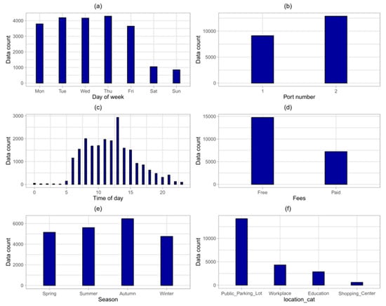 Figure 4 displays the distribution of the charging sessions over several categories of interest. Figure 4a shows the amount of sessions that began on each day of the week. It is apparent that there is a significant drop in public charging usage on Saturday and Sunday compared with the weekdays, which could show that most electric vehicles in this study are used for commuting to and from work. Figure 4b shows that port number two (on the right side, facing the wall) was used 19.6% more often than port number one. Figure 4c shows the distribution by time of day; 89.7% of the total sessions occurred between 6 a.m. and 6 p.m. Figure 4d shows that free stations were utilized 32.8% more than paid stations. In Figure 4e, slightly more sessions occur in summer and autumn that in spring and winter. Finally, Figure 4f shows that the majority of the charging sessions in this study come from public parking lots.