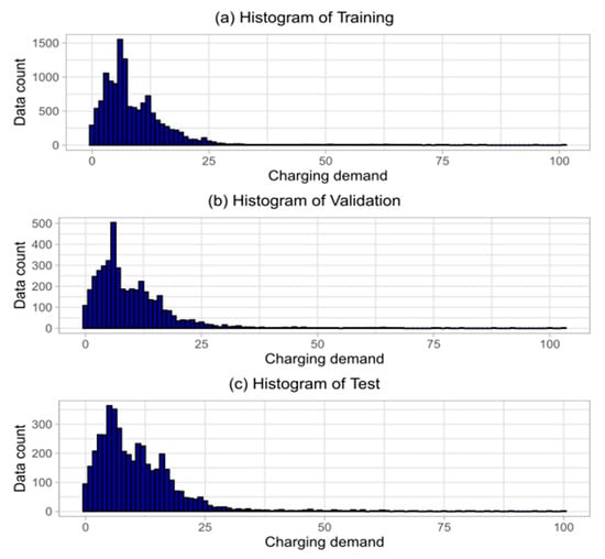 In total, there are 13,115 sessions in the training set, 4405 in the validation set, and 4483 in the test set. Figure 6 displays the distribution of charging demands in each set, and Table 3 presents statistics of each set. It can be seen that the overall distribution of each set is relatively similar, with a slight increase in average demand in the validation and test sets. This increase is well below the overall increase in session demand over the course of the study, shown previously in Figure 2, indicating that while the average user in this study charges for slightly more energy the longer they use public charging stations, the majority of the increase in energy demand per session is due to new users and vehicles.