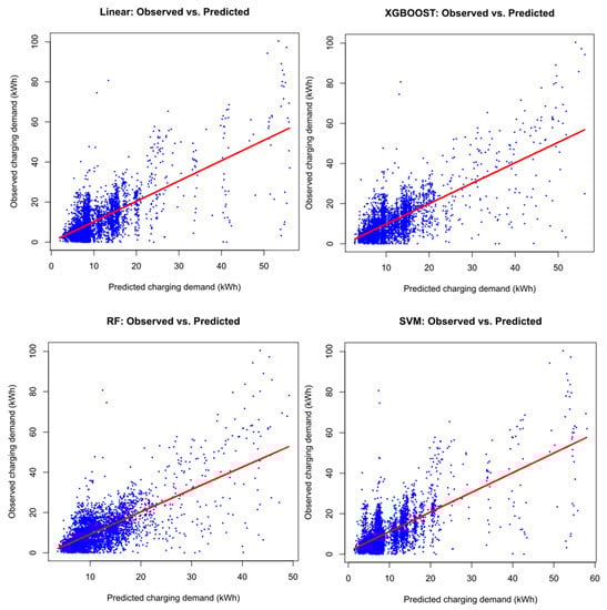One implication of these results is that, from the definition of R2, roughly 48% of the variance in charging demand by session cannot be accounted for by the aforementioned variables—rather, it represents the remaining ‘randomness’ in user behavior. More precisely, it indicates that the energy demand of an arbitrary session is a function of far more variables than are considered here, because it is information that will never be available to a charging station. Examples include all factors that might influence parking behavior at any of the public stations in this study, as well as driving behavior between recorded sessions. Nevertheless, all four prediction methods, XGBoost in particular, but linear regression as well, offer predictions of reasonable accuracy for many users.