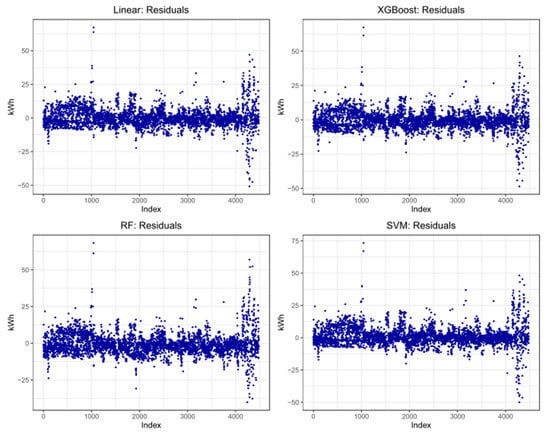 The predicted and observed values in the test set are shown for each method in Figure 7. Figure 8 displays the residuals for each charging session prediction, with the indices sorted by user, and then, by time. Finally, Figure 9 displays the histograms for the residuals of each method, in 1 kWh increments.