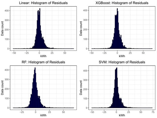 Histograms for the residuals of each method, in 1 kWh increments.