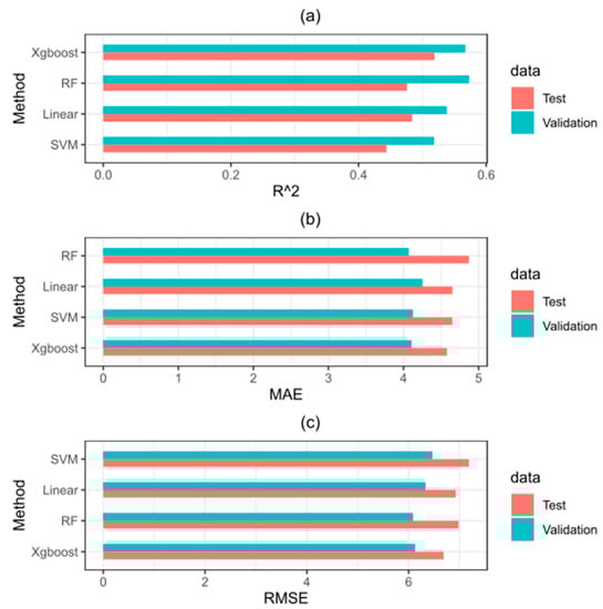 Accuracy metric comparisons including (a) R2, (b) MAE, and (c) RMSE for each method.