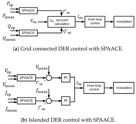 - Feasibility: Most real-world systems are non-linear in nature, for which linear (taking advantage of established linearization methods) and non-linear control approaches have been widely utilized. As SPAACE is an add on controller, its incorporation is independent of the control approach (linear or non-linear) and the non-linearities within the unit under consideration. Therefore, in theory, SPAACE can be incorporated within a unit under consideration for any application where precise and high-speed set point tracking is imperative. By enabling the unit under consideration to be treated effectively as a black box, SPAACE can increase the potential utilization of the existing infrastructure by reducing transients, which in turn reduces the need to overdesign the system.Furthermore, the stability of SPAACE was discussed in [46]. It was shown that the incorporation of SPAACE within an apparatus does not impact the stability of the wider system, i.e., if the system with the apparatus was stable without SPAACE, it will remain stable with the incorporation of SPAACE. Therefore, SPAACE can readily be adopted within power system applications, ranging from small isolated systems such as electric propulsion applications to larger systems such as HVDC segmented power systems.This paper, in particular, discusses the incorporation of SPAACE in DERs coupled to the remainder of the power system via power electronic interfaces (inverters or converters). This choice is motivated by the current practices and challenges faced by the community: transition to a renewable rich inverter-dominated grid (utility systems), interest in incorporation within small-scale systems with variable and flexible architectures (remote microgrids and propulsion applications), to name a few. Furthermore, it provides a more relevant example for demonstration as DER manufacturer’s practices historically present limitations in access to the internal parameters of the inverter and the unavailability of the system model with inverters.